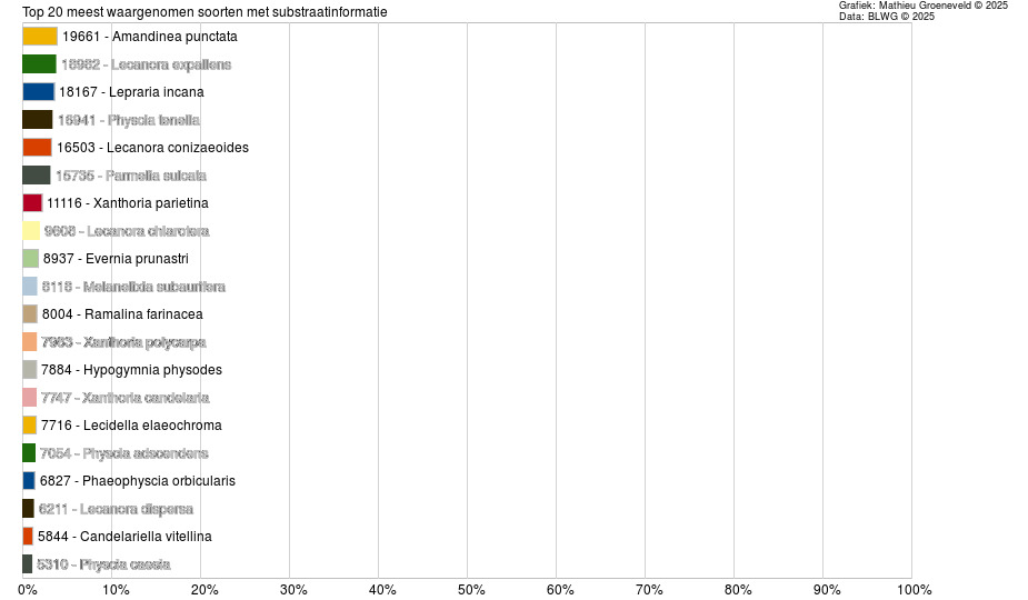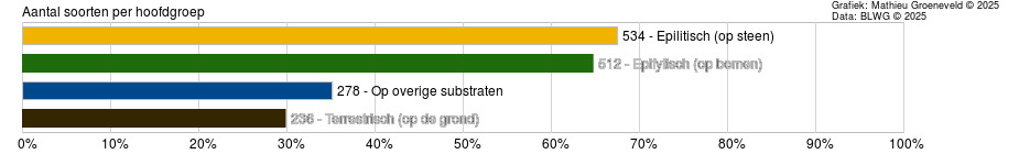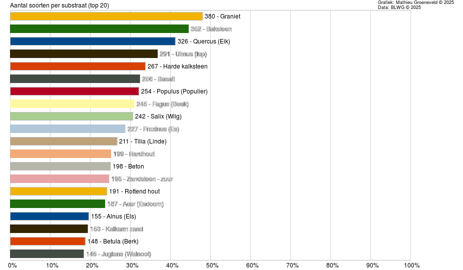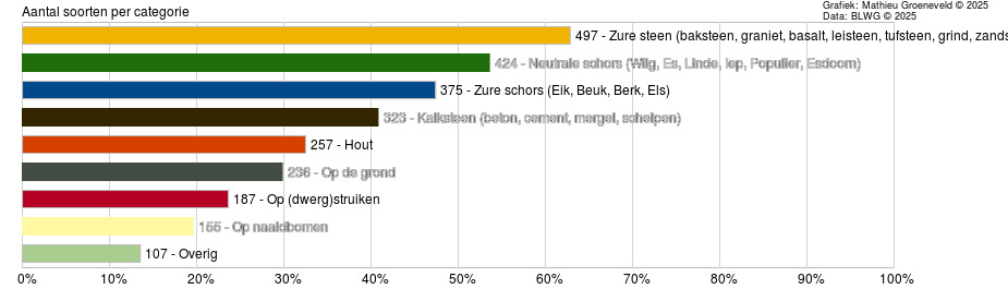 Het is tevens interessant om te kijken op welk substraat de meeste soorten zijn waargenomen: